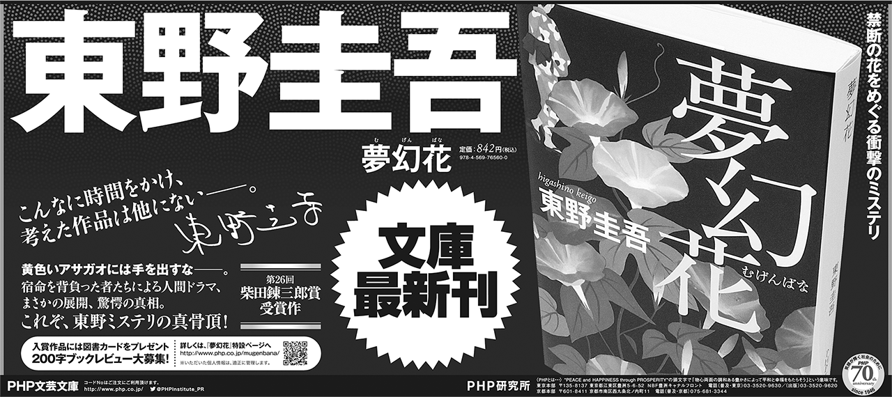 東野圭吾氏の文庫本広告。カバー写真を大きく扱うことでタイトルを省略し、登場感を打ち出した。